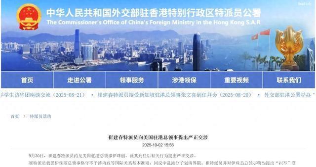 10月2日,外交部驻港特派员公署发布一则简短却极具份量的消息:崔建春特派员9月30日约见美国驻港总领事伊珠丽,就其到任后“有关行为”提出严正交涉,并明确提出“四不”要求——不见不该见的人、不与反中乱港分子串联勾结、不得煽动协助教唆资助反中乱港活动、不得干预涉港国安案件审理。 措辞之严厉、指向之清晰、底线之刚性,为近年来涉港外交交锋所罕见。它不仅是中方对美方的一次“当头棒喝”,更是一次制度性预警:香港事务纯属中国内政,任何外部势力若执意越线,必将撞得头破血流。 一、“四不”不是外交辞令,而是“一国两制”的排他性条款 “四不”看似针对个人,实则指向美方长期以来对港“隐形治理”的整套机制。自2019年“黑暴”以来,美国驻港总领馆以“领事职务”为掩护,在港布局一整套“政治干预链”:从为乱港头目提供庇护、资金到炮制制裁名单,从组织“座谈会”到为在押嫌犯“站台”。美方把总领馆变成“影子指挥部”,把“领事官员”变成“政治操盘手”,把外交豁免权变成“免责金牌”。 崔特派员此次亮出的“四不”,正是对这套灰色机制的“精准拆弹”——用四条不可谈判的负面清单,彻底封堵美方继续操盘的制度空间。 “四不”背后,是中央对“一国两制”排他性主权的再次确认:香港是中国的香港,任何外国驻港机构只能做“领事本分”,不能做“治港主角”;只能从事正常公务,不能染指中国国家安全;只能遵守《维也纳领事关系公约》,不能凌驾于基本法和香港国安法之上。 中方把话说得再明白不过:外交豁免不是“治外法权”,领事官员更不是“殖民总督”。 二、伊珠丽“行为”触碰三条高压线